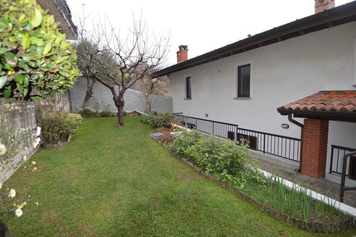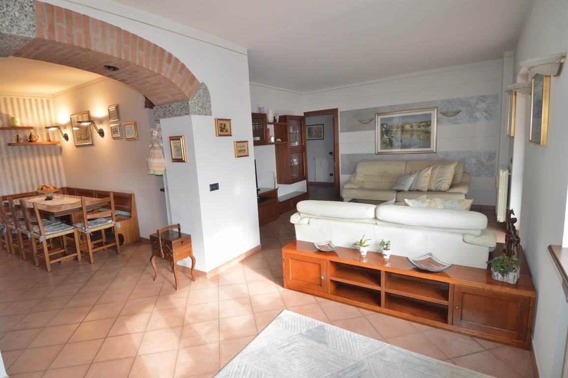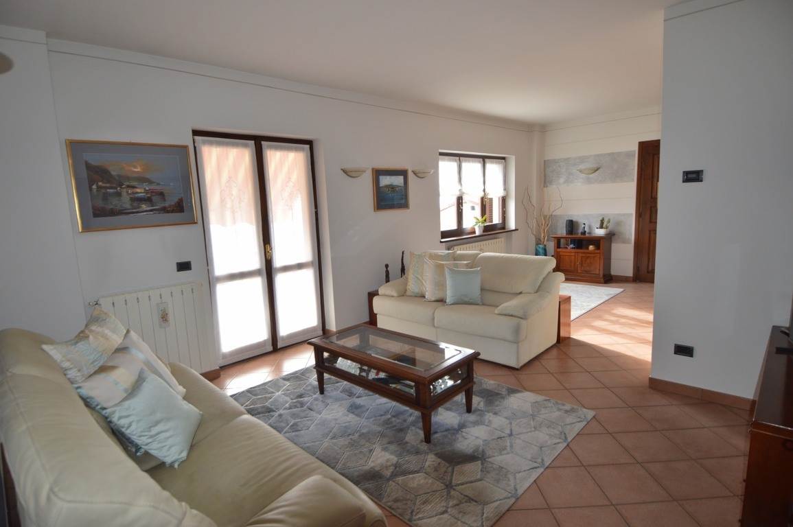Gli spazi dell' abitazione principale, della superficie di circa 110 mq. sono posti al primo piano dell'edificio e sono composti da un'ampia cucina, doppio soggiorno con terrazzo panoramico coperto, balcone, disimpegno zona notte, due camere doppie e due bagni. Dagli spazi di abitazione si può comodamente accedere al giardino privato molto ben tenuto di circa 120 mq. posto sul retro del fabbricato.